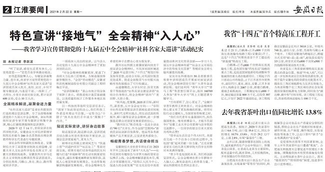 2020年12月14日,首场宣讲在皖西学院开讲,安徽农业大学经济管理学院院长孙超为200余名思想政治理论课教师和学生代表进行专题授课。