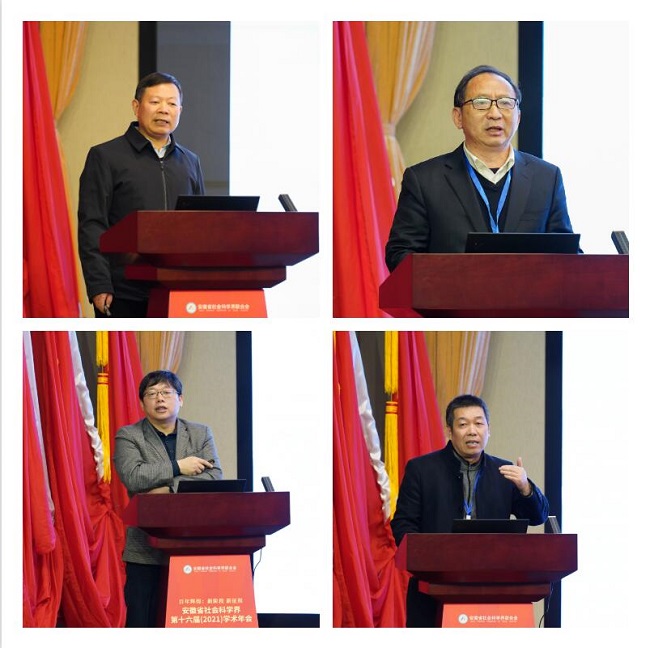 在专题研讨环节,安徽大学马克思主义学院党委书记吴家华教授,省政府参事、省社科院城乡所所长孔令刚研究员,安徽财经大学工商管理学院院长胡登峰教授,安徽师范大学科研处处长徐彬教授等围绕论中国共产党的历史主动精神、谋篇布局新赛道做长三角优长生、皖北“四化同步”与共同富裕、安徽文化的特点及其创新发展等方面作了专题发言。